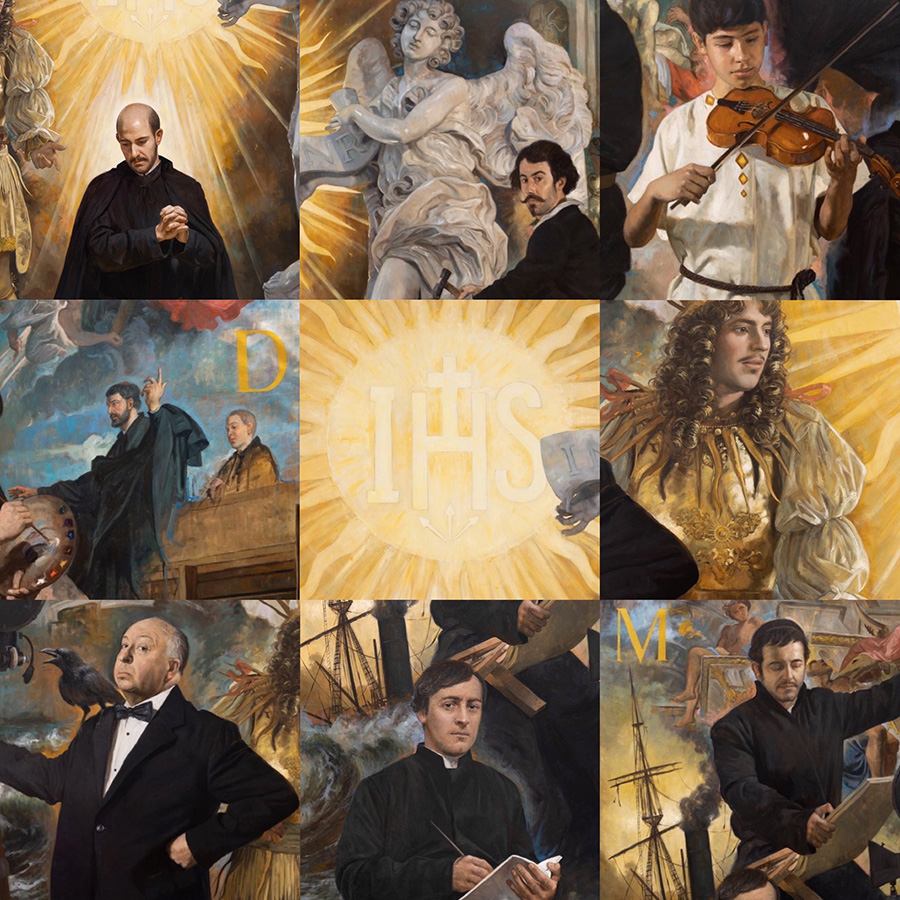 В картине художник изобразил связь между иезуитами и семью изящными искусствами. Сам художник так описывает ее: в центре композиции изображен символ Общества Иисуса – Солнце с надписью «IHS»; внизу – коленопреклоненный святой Игнатий Лойола, молящийся о том, чтобы Общество Иисуса принесло плоды; вокруг расположены семь сцен, показывающие связь между иезуитами и изящными искусствами, а именно: скульптурой, музыкой, живописью, танцем, кино, литературой и архитектурой. Олицетворяют их соответственно: Бернини, Доменико Циполи, Рубенс, король Людовик XIV, Альфред Хичкок, Джерард Мэнли Хопкинс и брат Андреа Поццо.