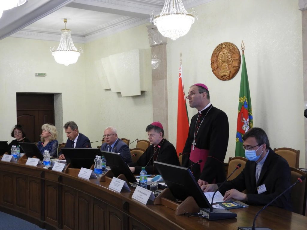 Его преосвященство Апостольский нунций в Республике Беларусь архиепископ Анте Йозич в своей речи сказал: «Пандемия Covid-19 – насущный вопрос врачебной этики в современном мире. Сегодня я осуществляю свой первый визит в Витебск, узнав, что конференция проходит в тесном и плодотворном сотрудничестве между епархией Римско-католической церкви, университетами Витебска, светской властью, дабы засвидетельствовать близость Святейшего Отца Франциска как его представитель в Республике Беларусь. <…> От пандемии страдает семья. В год святого Иосифа Папа Франциск призывает обратиться к энциклике “Amoris letitia” (Радость любви). В период пандемии Covid-19 стало очевидным, что семья является точкой отсчёта, ядром человеческого сообщества. Необходим диалог представителей церкви и медицинского сообщества, так как человек – это общность души и тела». В завершение своей речи Апостольский нунций переда всем присутствующим благословение Папы Франциска.