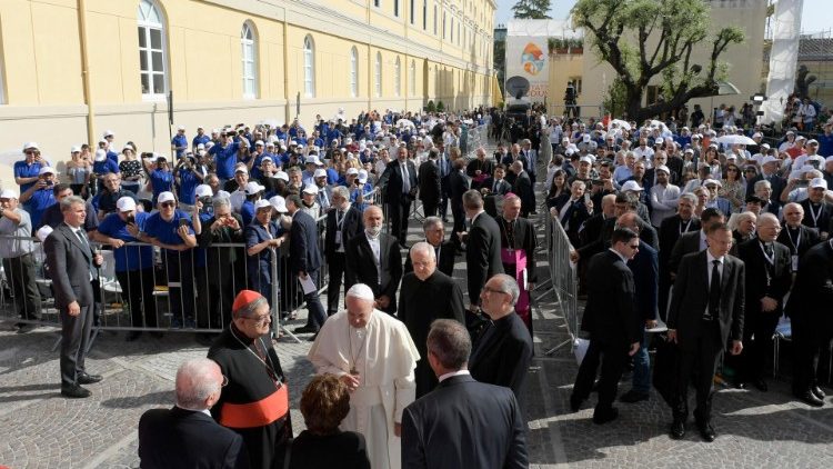 Папа Франциск начал свою речь с напоминания о том, что Средиземноморье издавна является перекрестком, местом обмена, но также и столкновений, и сегодня оно ставит перед нами целый ряд вопросов. Чтобы ответить на них, необходимо разработать «богословие приятия» для «подлинного и искреннего диалога… ради созидания мира, инклюзивного, братского общества и ради защиты творения».